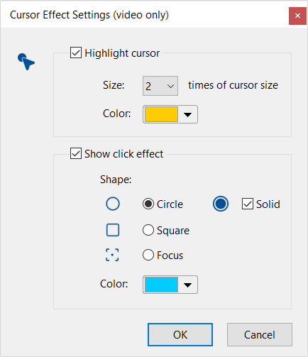 Show click effect - when you need to show where cursor clicks occur in a recorded video. You can choose one of the following shapes.