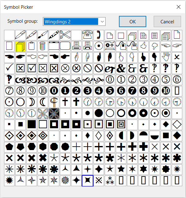 Symbols are like icons that you can place anywhere as an object. When the Symbol tool is clicked, you can choose a symbol from the Symbol Picker dialog. Click the Symbol group dropdown to show the available symbols.