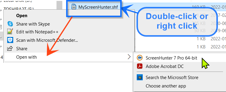SHFs created using ScreenHunter 7 Pro 32-bit can be read into ScreenHunter 7 Pro 64-bit. However, SHF files created using 64-bit cannot be read into a 32-bit ScreenHunter 7 Pro.