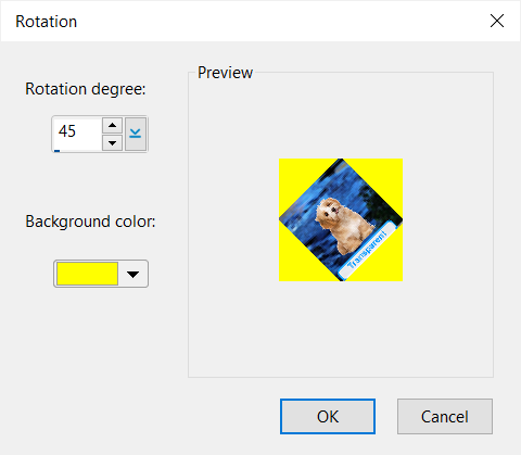 On the Rotation dialog, you can choose a degree to rotate and a background color. Rotation will always apply to the whole image, not a selection.