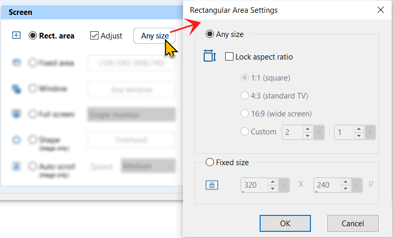 - Capture a fixed area on the screen. When selected, more timer features are available in the Timer group.