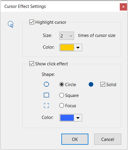 Show click effect - when you need to show where cursor clicks occur in a recorded video. You can choose one of the following shapes.