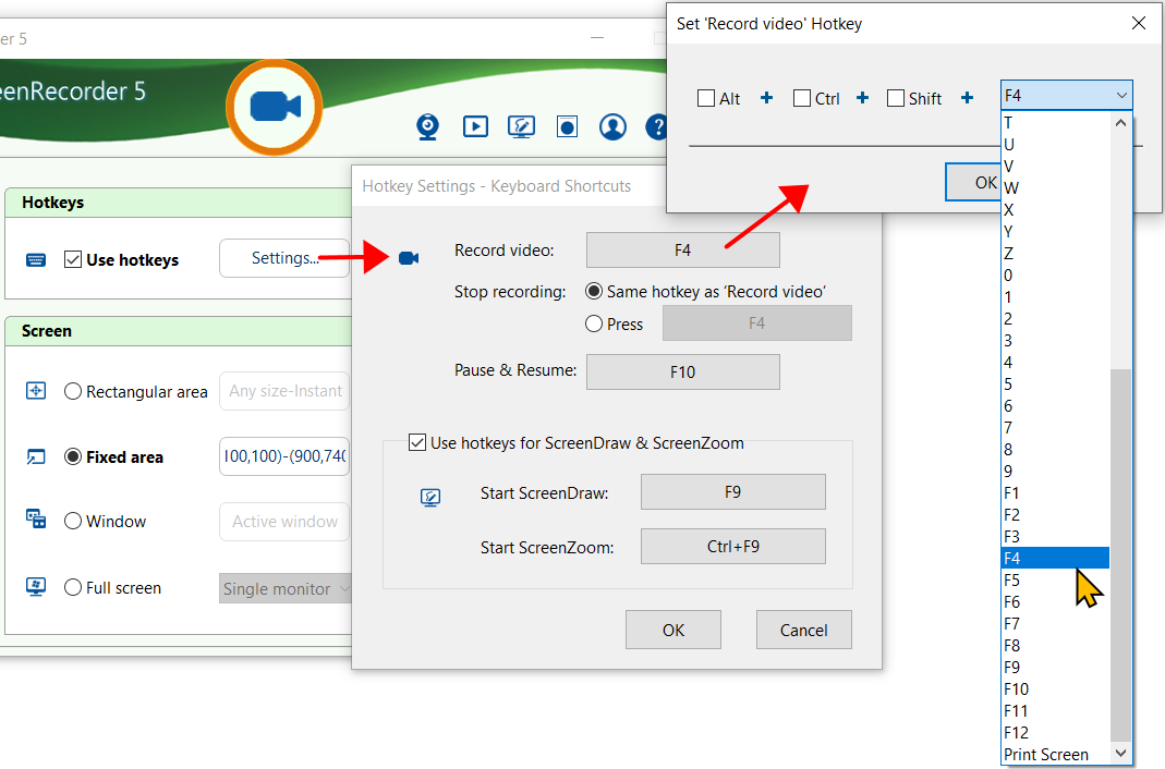 Use hotkeys - Check to use keyboard shortcuts. Click the button on the right to assign and change keyboard hotkeys to record.