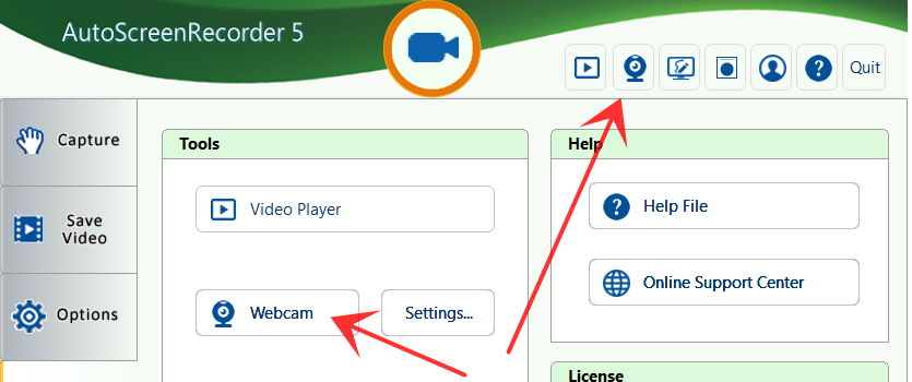 Show the webcam so you can record it in a video. Click the webcam icon to toggle between show and hide.