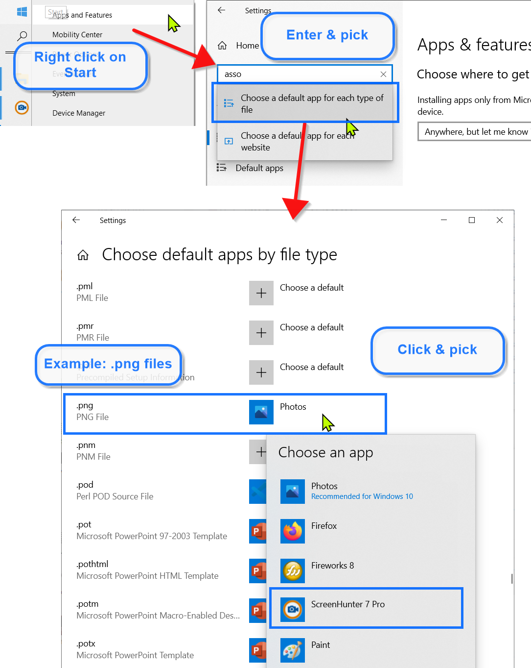 By default, only .SHF files are associated with ScreenHunter 7 Pro. All other image files may have different viewing/editing programs associated.