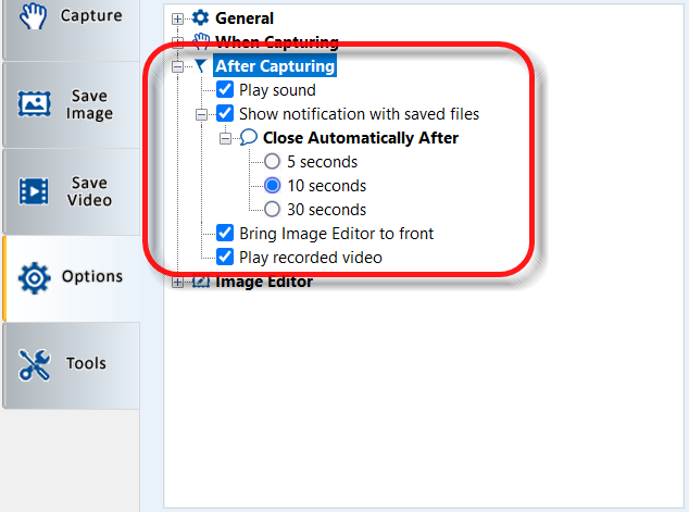 保存されたファイルを表示 - チェックすると、デスクトップ ツールバーの横に自己終了通知が表示されます。 持続時間を 5 秒、10 秒、30 秒から選択します。